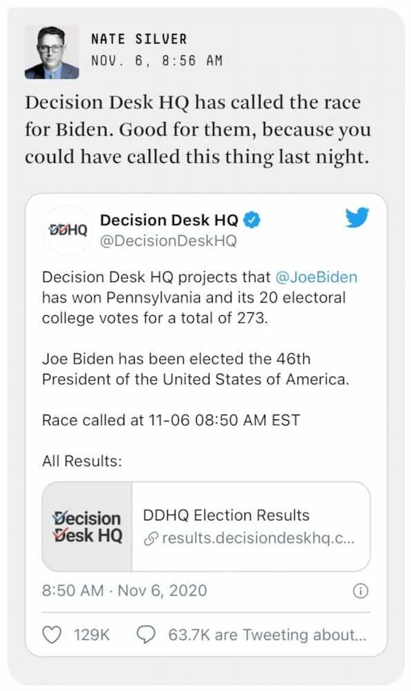 First, the election situation is resolving. In the early-morning hours, the lead shifted to Biden in both Georgia and Pennsylvania, and his lead is growing in both places (and in Arizona and Nevada) as the the remaining votes are counted. I think it’s nearly all over but the crying and whining and poor-loser-ing.