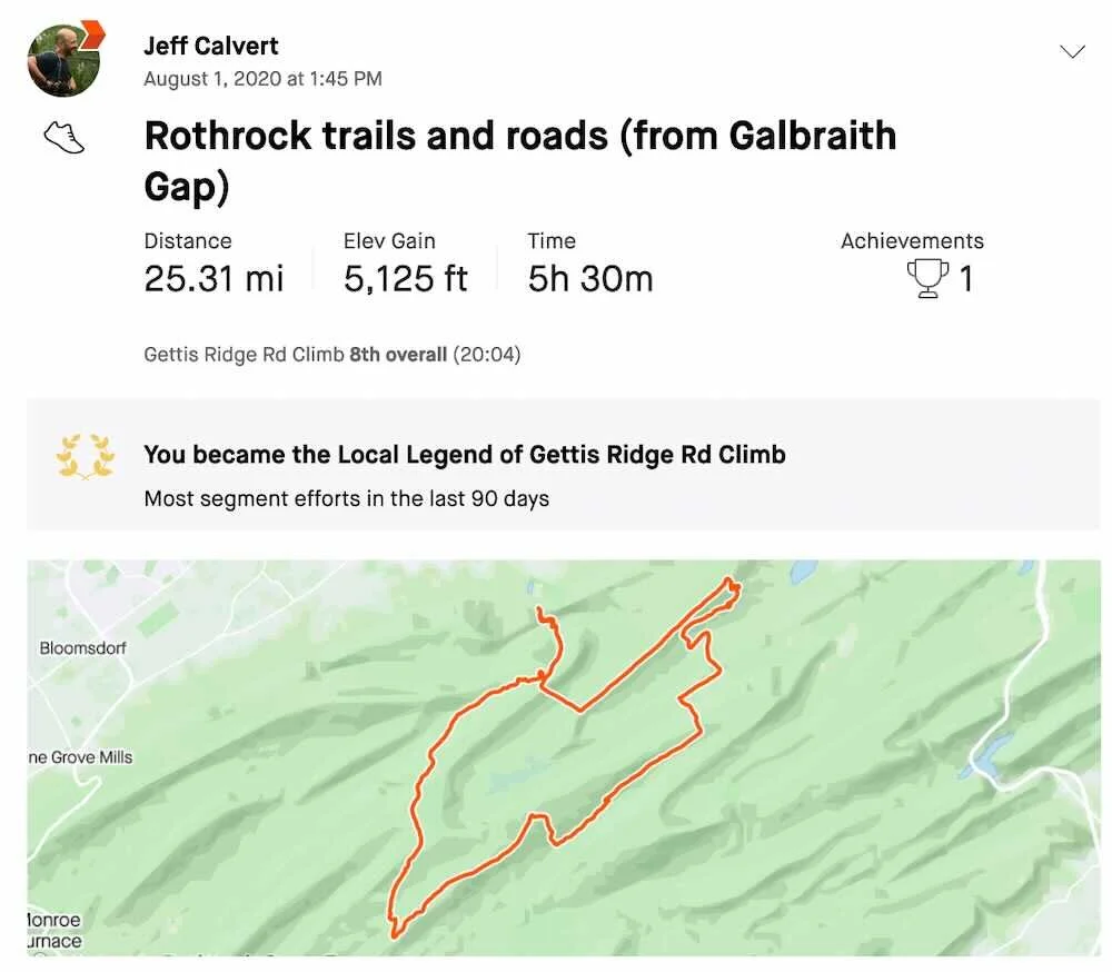 I managed over 25 miles yesterday, with over 5,000 feet of climbing and an average pace of 14:36. That’s not as great as it sounds, because I included a lot of roads in the route, but it was also in the 80s (at least when I started) and the trail parts included some PA-level technical stuff. It’s hard to quantify all of that, so I’ll just say it was a hard effort that I managed well.